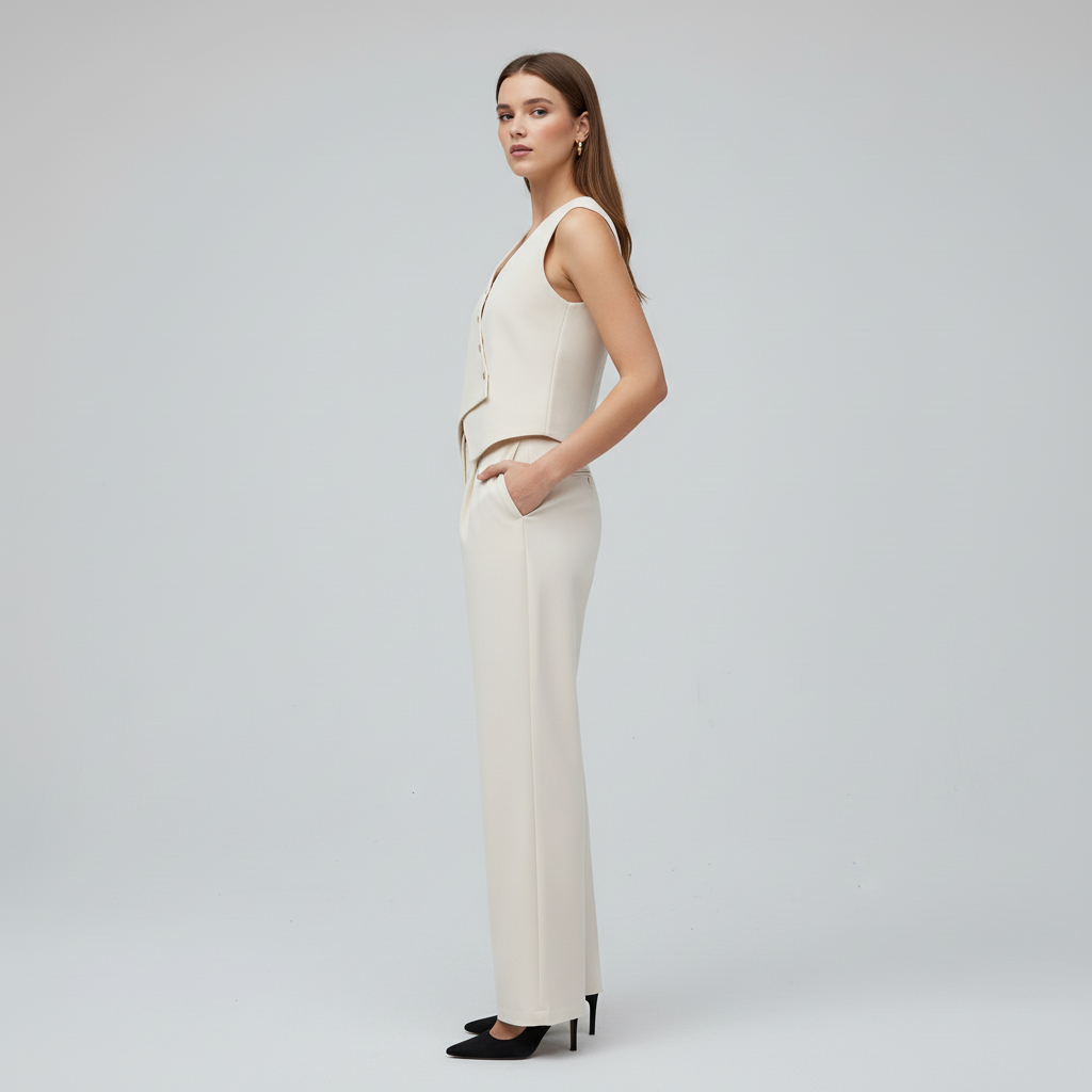 This set is a perfect marriage of timeless tailoring and contemporary design. The waistcoat is a refined statement piece, featuring a sharp V-neckline and a unique asymmetric hem that creates a flattering, elongated silhouette. The front is detailed with contrasting button closures, adding a touch of visual interest.